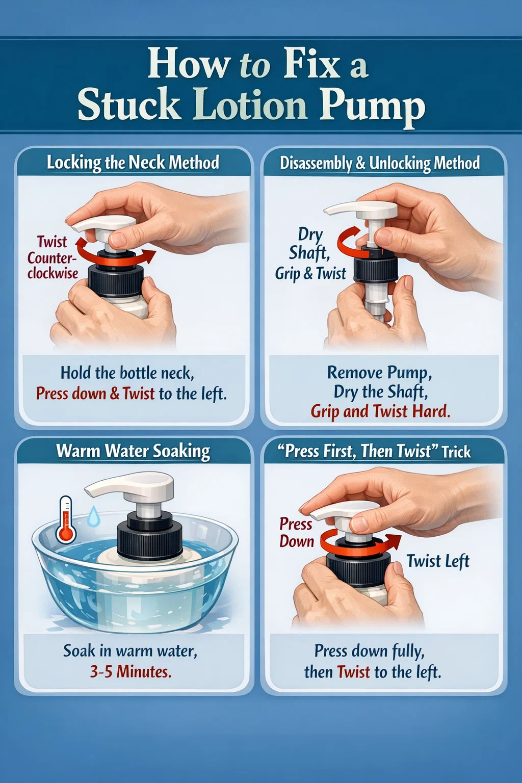 Este destul de frustrant când ai achiziționat nou pompa de lotiune nu va apărea indiferent cât de mult îl răsuciți. De obicei, acest lucru se datorează faptului că mecanismul de blocare intern este prea strâns sau nu îl rotiți în mod corect.
