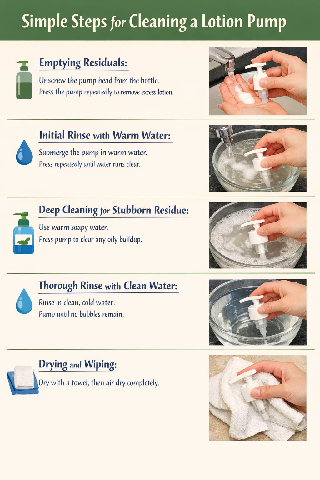 Curățarea unei pompe de loțiune este de fapt destul de simplă. Cu metoda potrivită, puteți îndepărta cu ușurință produsul rezidual, asigurând curățenia și prevenind înfundarea pentru utilizare ulterioară.