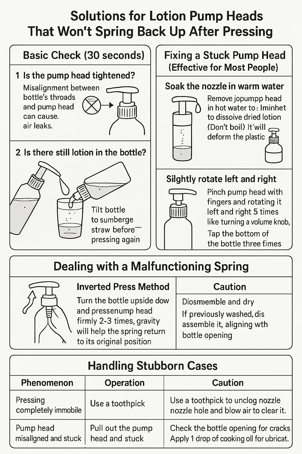 | Capul pompei strâmb/blocat | Ridicați, realiniați cu gâtul sticlei, reinstalați | Verificați mai întâi gâtul sticlei pentru crăpături |