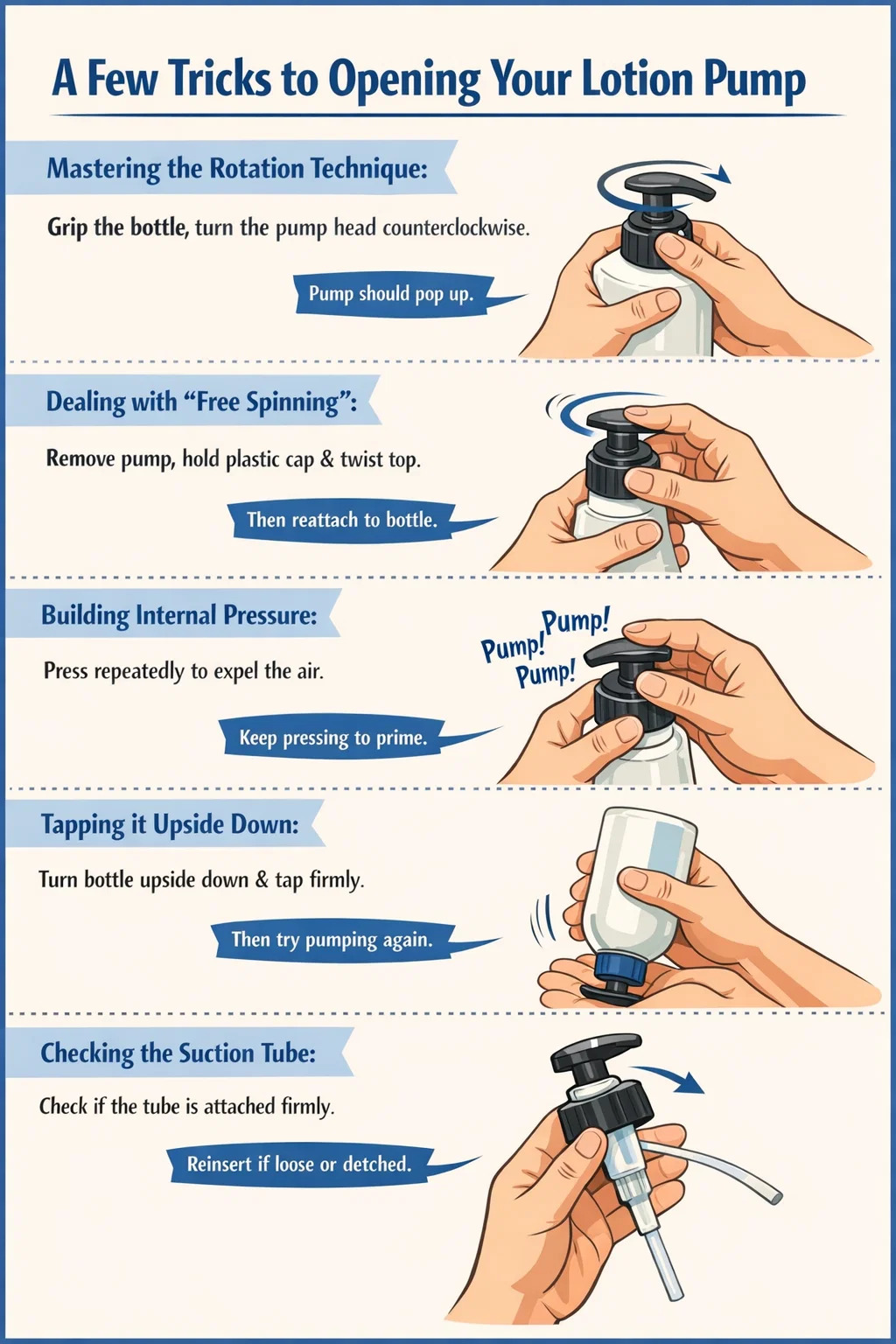 Operare: În acest moment, trebuie să aveți răbdare și să apăsați continuu și rapid. Pentru unele sticle mari de loțiune sau creme deosebit de groase, poate fi necesar să apăsați de zeci de ori pentru a elimina aerul din tub și a trage lichidul în sus de jos.